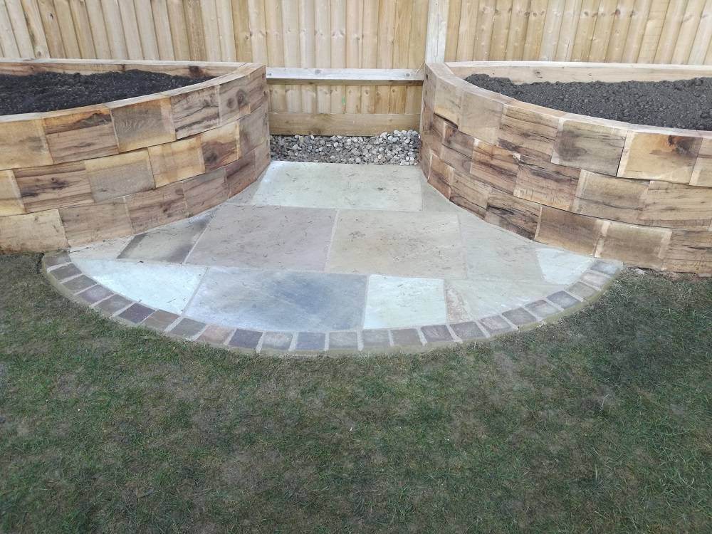 From the entrance points of the house (the side door, rear door and patio door) a single step was built to make access to the outside easier. Using sandstone paving with sweeping curve cut to the whole length of garden a patio was laid. Where this met the lawn, the cut edge was finished with small 10cm squared tumbled sandstone blocks laid to the leading edge of the installation.